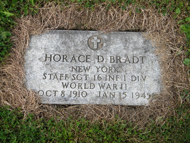 Horace D. Bradt was born on October 8, 1910. He served in the U.S. Army during World War II as a Staff Sergeant in the 16th Infantry Regiment, 1st Infantry Division. He died on January 15, 1945 at the age of 34 and is now buried in Evergreen Memorial Park, Colonie, Albany County, New York, USA.