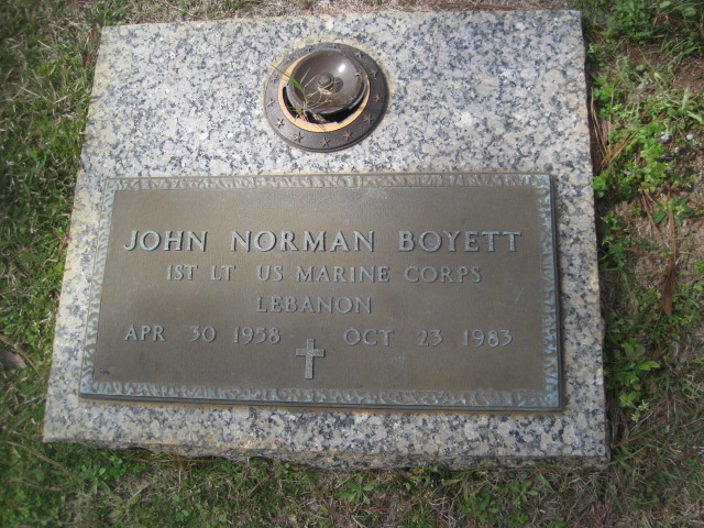 John Norman Boyett was born on April 30, 1958 in Chattanooga, Hamilton County, Tennessee. He served in the United States Marine Corps as a First Lieutenant. John was killed in the terrorist bombing of the United States Marine barracks. In the early morning hours of 23 Oct. 1983, a truck loaded with explosives crashed through the security perimeter of the USMC Barracks in Beirut, Lebanon. In the explosion that followed, 241 US Military personnel were killed and 80 serious wounded. He is now buried in the Crown Hill Cemetery, Albany, Dougherty County, Georgia, USA.
