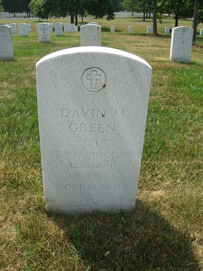 Davin Marcell Green was born on July 16, 1963 in Baltimore, Baltimore City, Maryland. He served in the United States Marine Corps as a Corporal. Davin was killed in the terrorist bombing of the United States Marine barracks. In the early morning hours of 23 Oct. 1983, a truck loaded with explosives crashed through the security perimeter of the USMC Barracks in Beirut, Lebanon. In the explosion that followed, 241 US Military personnel were killed and 80 serious wounded. He is now buried in the Arlington National Cemetery, Arlington, Arlington County, Virginia, USA. His name is commemorated on the Beirut monument, on the grounds of the US Embassy in Lebanon and ranked as a Lance Corporal.