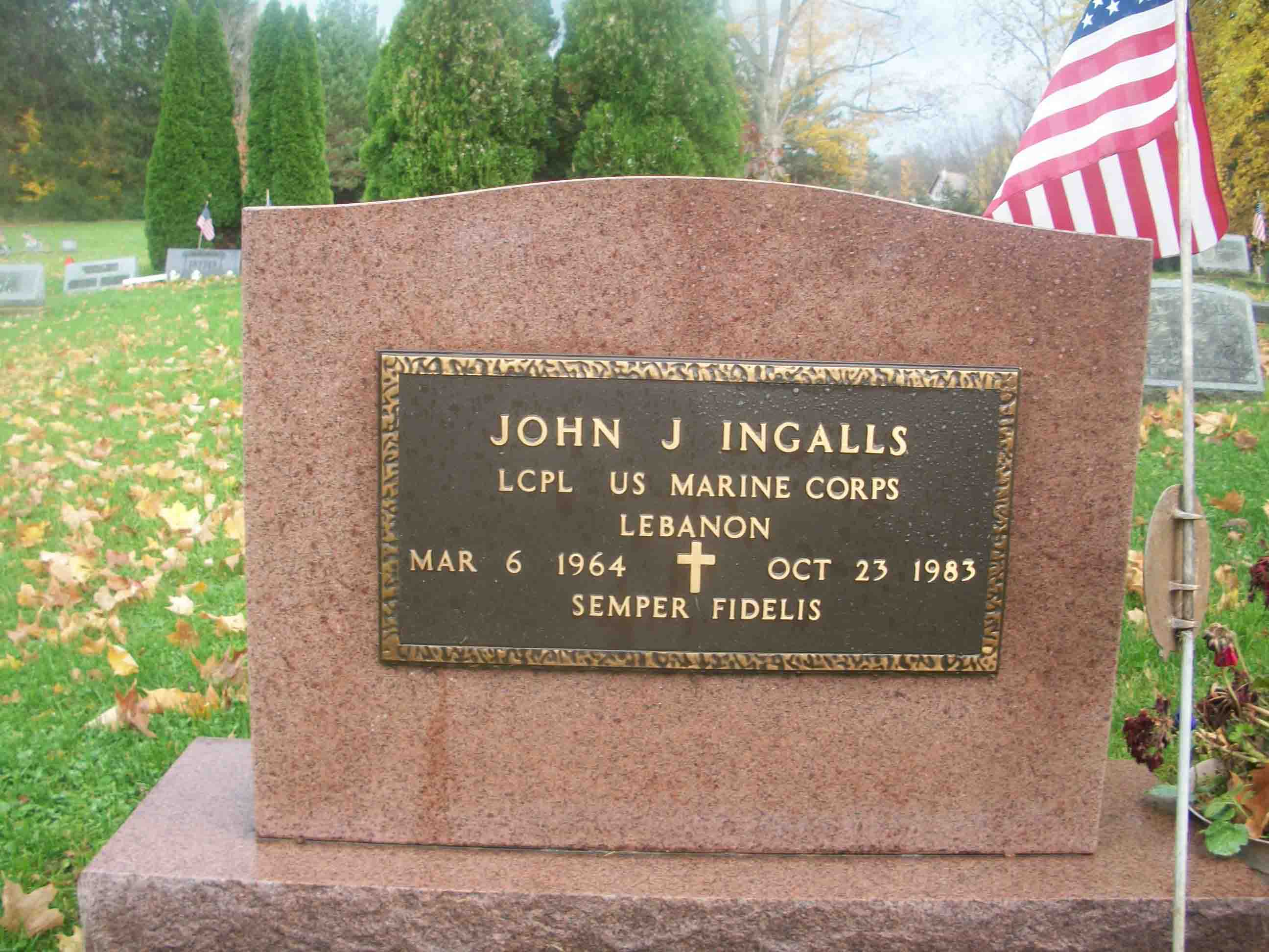 John Jay Ingalls was born on March 6, 1964 in Massachusetts. He served in the United States Marine Corps as a Lance Corporal. John was killed in the terrorist bombing of the United States Marine barracks. In the early morning hours of 23 Oct. 1983, a truck loaded with explosives crashed through the security perimeter of the USMC Barracks in Beirut, Lebanon. In the explosion that followed, 241 US Military personnel were killed and 80 serious wounded. He is now buried in the Lake View Cemetery, Interlaken, Seneca County, New York, USA. His name is commemorated on the Beirut monument, on the grounds of the US Embassy in Lebanon and ranked as a Private First Class.