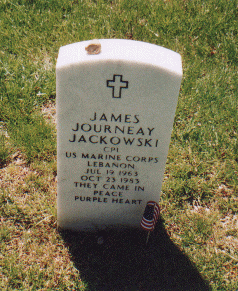 James Journeay Jackowski was born on July 19, 1963 in Nassau, Rensselaer County, New York. He served in the United States Marine Corps as a Lance Corporal. James was killed in the terrorist bombing of the United States Marine barracks. In the early morning hours of 23 Oct. 1983, a truck loaded with explosives crashed through the security perimeter of the USMC Barracks in Beirut, Lebanon. In the explosion that followed, 241 US Military personnel were killed and 80 serious wounded. He is now buried in the Long Island National Cemetery, East Farmingdale, Suffolk County, New York, USA. His headstone shows his rank as a Corporal.