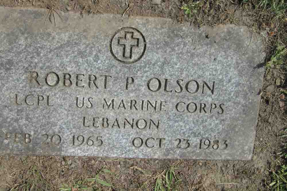 Robert Paul Olson was born on February 20, 1965 in Minneapolis, Hennepin County, Minnesota. He served in the United States Marine Corps as a Private First Class. Robert was killed in the terrorist bombing of the United States Marine barracks. In the early morning hours of 23 Oct. 1983, a truck loaded with explosives crashed through the security perimeter of the USMC Barracks in Beirut, Lebanon. In the explosion that followed, 241 US Military personnel were killed and 80 serious wounded. He is now buried in the Holy Spirit Cemetery, North Collins, Erie County, New York, USA. His headstone shows his rank as a Lance Corporal.