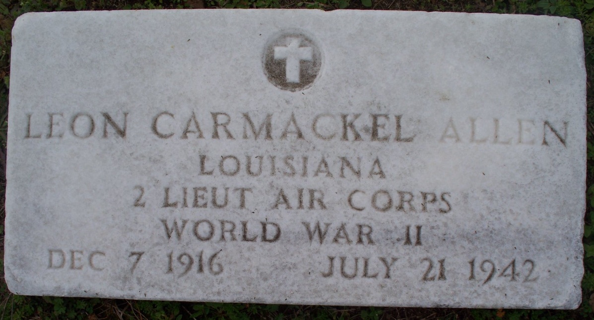 Lieutenant Allen took his flight training first at Randolph Field and later at Kelley Field, Texas, where he received his wings and a commission as a Second Lieutenant in the Army Air Corps. He was Killed in Action on July 21, 1942 at the age of 24 in an airplane accident in the Far Eastern theater and is now buried in the Minden City Cemetery, Minden, Webster Parish, Louisiana, USA.