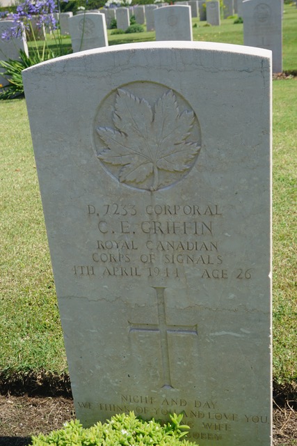 Charles Edward Griffin was born on January 16, 1920 in Los Angeles, California. He joined the Canadian Army and served in the Corps of Signals in the Canadian 5th Armored Division. He died on April 4, 1944 and is buried in the Commonwealth War Grave commission cemetery at Salerno.
