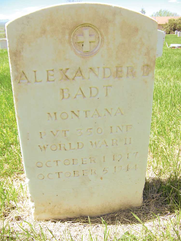 Alexander B. Badt was born on October 1, 1917 in Montana. He was the son of Henry Badt and Mollie Damm Badt. Alexander served in the US Army as a Private during World War II. He died on October 5, 1944 at the age of 27 in Italy and is now buried in the Custer National Cemetery, Crow Agency, Big Horn County, Montana, USA. A member of the 2nd Battalion, 350th Infantry Regiment, his unit was cited for outstanding performance of duty in action during the period 27 September to 3 October 1944 at Mt. Battaglia, Italy against German forces. For seven days, amidst powerful counterattacks, the men of the battalion repulsed each attack with fighting ability and teamwork, therefore, their objective was accomplished.