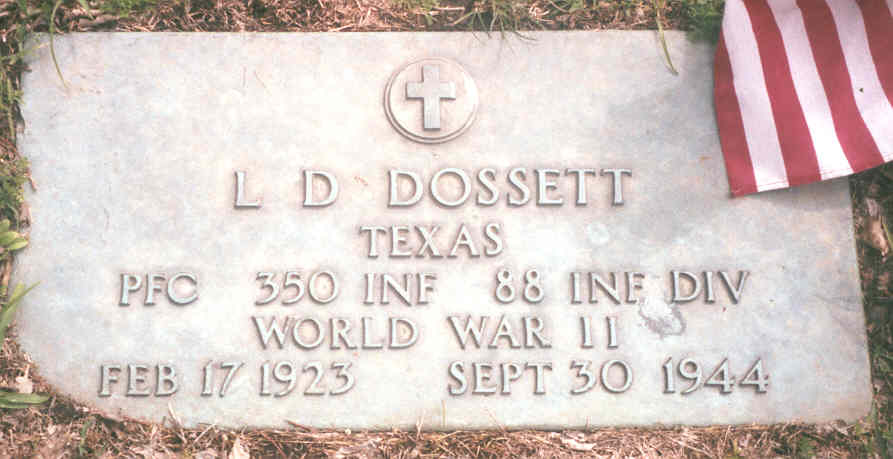 L. D. Dossett was born on February 17, 1923 in Texas. He served in the US Army as a Private First Class during World War II. L. D. died on September 30, 1944 at the age of 21 in Italy and is now buried in the Sowers Cemetery, Irving, Dallas County, Texas, USA. A member of the 2nd Battalion, 350th Infantry Regiment, his unit was cited for outstanding performance of duty in action during the period 27 September to 3 October 1944 at Mt. Battaglia, Italy against German forces. For seven days, amidst powerful counterattacks, the men of the battalion repulsed each attack with fighting ability and teamwork, therefore, their objective was accomplished.