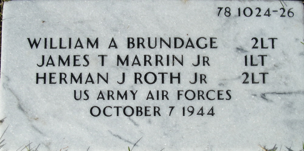 B-26 #42-96220 took off from Beaumont-Sir-Oise, France on a bombing mission over Hengelo marshalling Yard, Netherlands. They were hit by ground anti-aircraft fire and crashed near Eleve, Netherlands during the war. William was "Killed In Action" in this crash. He was originally interred overseas and was later repatriated on April 18, 1950. He is now buried in the Jefferson Barracks National Cemetery, Lemay, St. Louis County, Missouri, USA in the same grave with 1Lt Marrin and 2Lt Roth. 1Lt Brundage's rank on their headstone is in error as his burial card shows "1/LT".