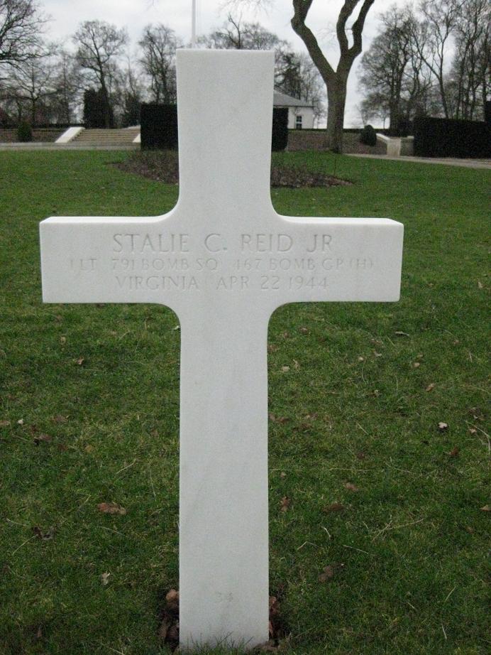 Stalie C. Reid, Jr. was born on January 2, 1919 in Hinton, West Virginia. He served as a First Lieutenant and Pilot in the 791st Bomber Squadron, 467th Bomber Group, Heavy on B24 #42-52445 aircraft during World War II. On April 22, 1944 while returning from bombing the railway marshalling yards at Hamm (Germany), the craft was shot at from the rear by ME-410 intruder aircraft of Kampfgeschwader 51, which had entered the landing pattern of returning aircraft. Seven men were killed (including 1LT Reid) and 3 men bailed out safely. 1LT Reid is now buried in the Cambridge American Cemetery, Cambridge, United Kingdom.