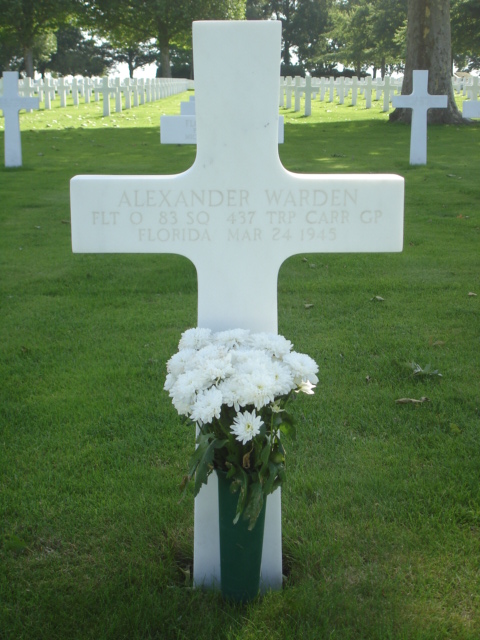 Alexander Warden entered the military service in Florida. He served in the 83rd Troop Squadron, 437th Troop Carrier Group as a Flight Officer during World War II. He died on March 24, 1945 and is buried now in the Netherlands American Cemetery, Margraten, Netherlands.
