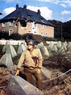 With the support of Generals Bradley and Eisenhower, Huebner persisted and the morale of the division gradually recovered. As the commander of the "Big Red One" in World War II, Huebner led the 1st in the assault on Omaha Beach, followed by a successful infantry attack at Saint-Lô. The 1st later repelled a German counteroffensive at Mortain, and pursued the German Army across France, culminating in the Battles of Aachen and the Huertgen Forest.