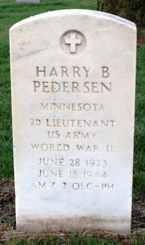Listed as missing in action, unrecoverable or unidentifiable, 2LT Pedersen's remains were recovered and identified in 1957. His remains are interred at the Fort Snelling National Cemetery, So. Minneapolis, MN. 2LT Pedersen's name is permanently inscribed on the tablets of the Missing at the Normandy American Cemetery and Memorial at Colleville-Sur-Mer/St. Laurent-sur-Mer, France. His name is also commemorated on a plaque located at Great Chart, England, but his middle initial is inscribed as H.