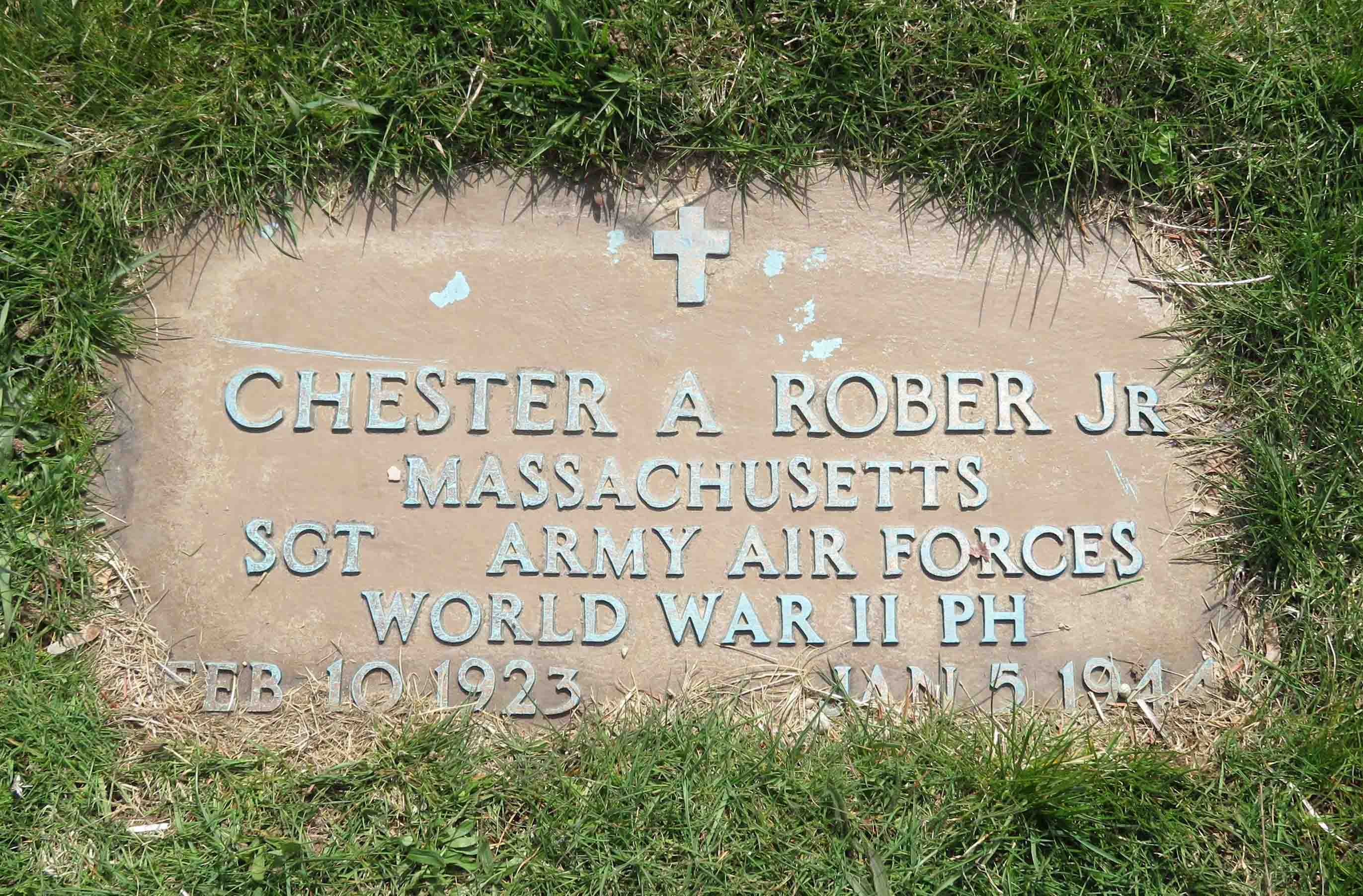 Chester A. Rober, Jr. was born on February 10, 1923. He served in the 550th Bomber Squadron, 385th Bomber Group, Heavy, as a Sergeant and Radio Operator/Gunner of the B-17 #42-3544 'Stars and Stripes' during World War II. He was Killed in Action on January 5, 1944, when his B-17 crash-landed at Badwell Ash, Suffolk, England, while attempting to reach their base after the aircraft was severely battle damaged on a bombing mission over Bordeaux, France. Seven of his crewmates were also Killed In Action, only the tail gunner survived.