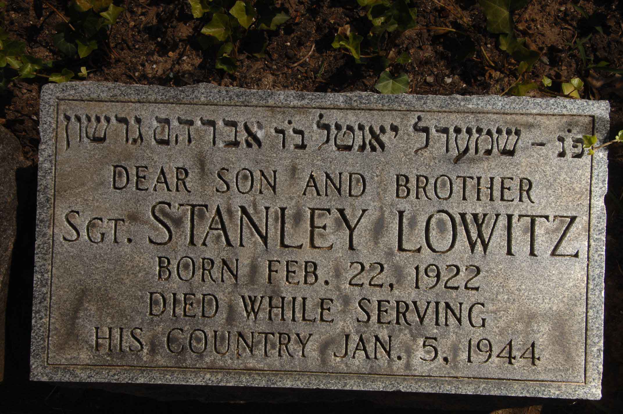 Stanley Lowitz was born on February 22, 1922, in New York. He served in the 550th Bomber Squadron, 385th Bomber Group, Heavy, as a Sergeant and Waist Gunner of the B-17 #42-3544 'Stars and Stripes' during World War II. He was Killed in Action on January 5, 1944, when his B-17 crash-landed at Badwell Ash, Suffolk, England, while attempting to reach their base after the aircraft was severely battle damaged on a bombing mission over Bordeaux, France. Seven of his crewmates were also Killed In Action, only the tail gunner survived.