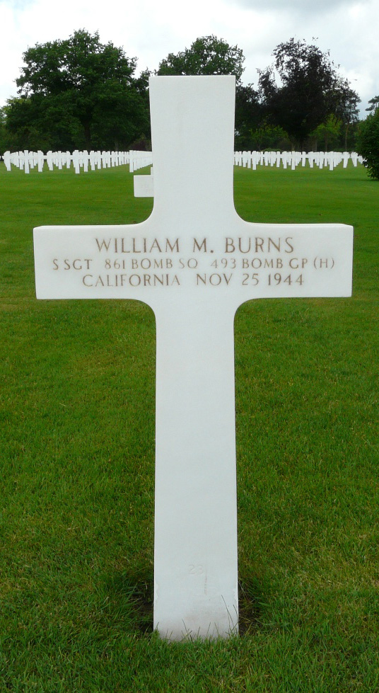 William M. Burns entered military service in California. He served in the 861st Bomber Squadron, 493rd Bomber Group, Heavy, as a Staff Sergeant and Tail Gunner on the B-17G #43-38232 'Proud Pappy' during World War II. He was Killed in Action when his B-17 was shot down over Germany on November 25, 1944. The flight began smoothly, but the weather was bad over the target, and the flak was heavy. Proud Pappy was hit and exploded over Muschwitz, which is about 30 km southeast of Merseburg. Seven crew members were killed, and two others were taken as prisoners.