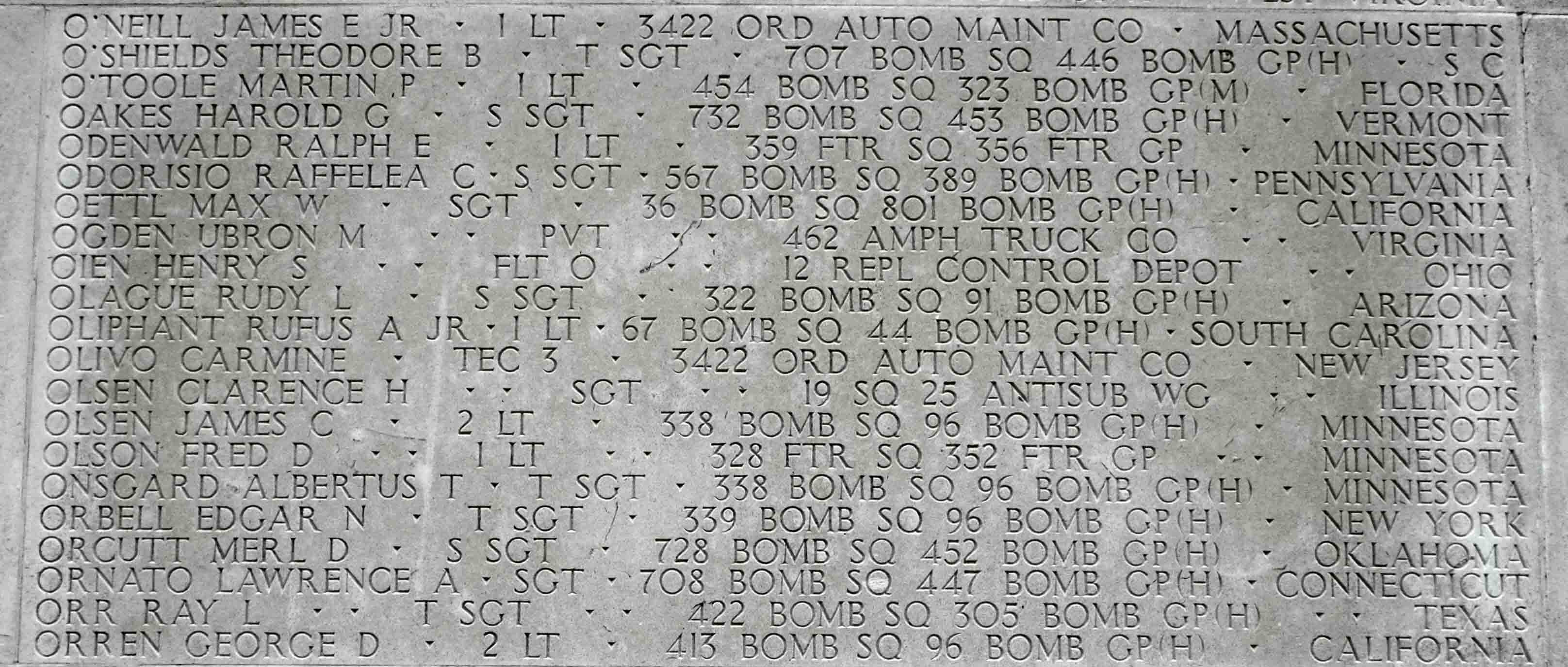 Ralph was declared Missing in Action on a camera gunnery mission on February 4, 1945. He split-essed at 13,000 ft. and as he was pulling out of it, he apparently rolled and started another split-ess. His aircraft disappeared through the overcast and was not seen again by the other members of his element, nor were they able to contact him by radio. A P-51 was later reported to have gone into the water at Bradwell Bay, England, at approximately the time that Lt. Odenwald was last seen. His plane presumably went down on the English Channel. No wreckage was ever recovered.