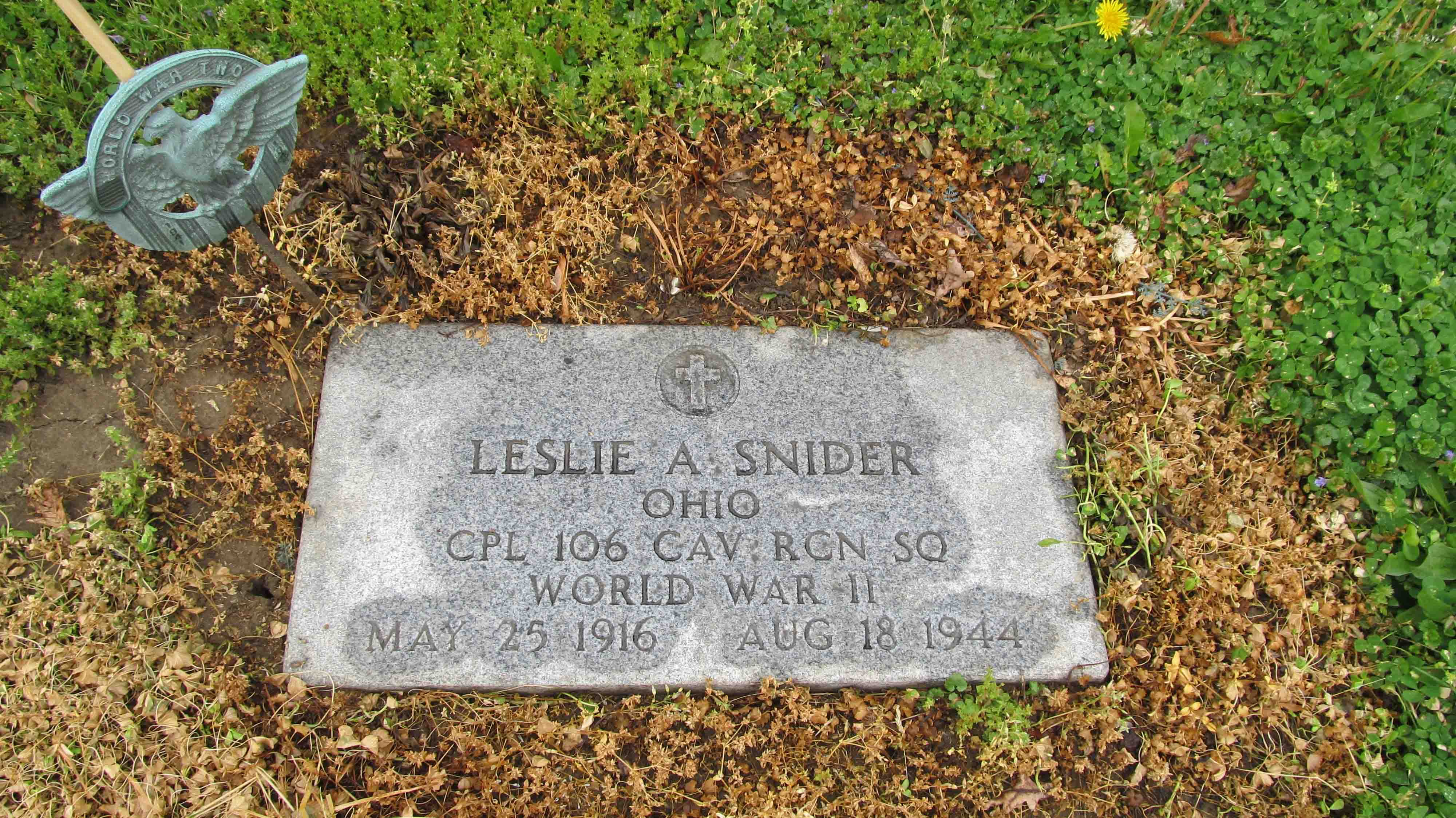 Leslie served in the 106th Cavalry Reconnaissance Squadron as a Corporal during World War II. He was Killed in Action on August 18, 1944, during the liberation of Vexin in France. Cpl Snider is now buried in the Oakwood Cemetery, Fremont, Sandusky County, Ohio, USA.