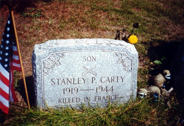 Stanley served in the 117th Infantry Regiment, 30th Infantry Division, as a Staff Sergeant during World War II. He was Killed in Action on August 28, 1944, at the age of 24, during the liberation of Vexin, France. SSgt Carty is now buried in the Zion Cemetery, Bargaintown, Atlantic County, New Jersey, USA.