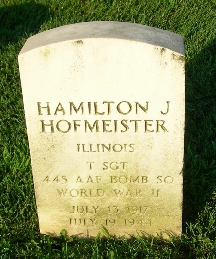 On July 19, 1944, two groups of aircraft, a total of 36 twin-engine American bombers of the 32nd Bomb Group, the 451st Bomber Squadron, took off from Station 485 in Andrew Field, England, for a bombing raid on Nantes. At 7:58 PM, 'The Sheriff Rapides Parish Louisiana' was shot down by flak, hitting the left engine and setting the bomb bay on fire. Two crew members were able to bail out, but those who didn't make it were killed in this incident. TSgt Hofmeister was one of the casualties. He is now buried in the Walnut Hill Cemetery, Belleville, St. Clair County, Illinois, USA.