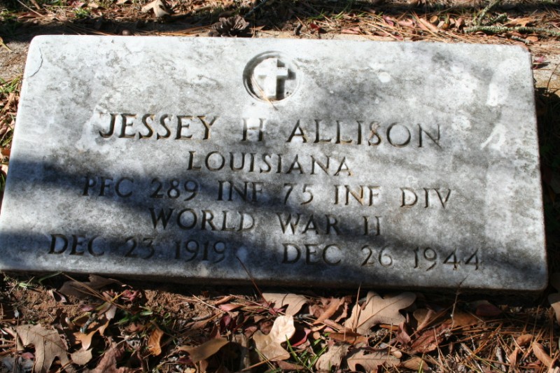 Jessey served in the 289th Infantry Regiment, 75th Infantry Division, as a Private First Class during World War II. He was Killed in Action on December 26, 1944, in/near Grandménil, Belgium, and is now buried in the Plain Dealing Cemetery, Plain Dealing, Bossier Parish, Louisiana, USA. His name is commemorated on a plaque located in the Manhay History 44 Museum, Manhay, Belgium, but he is listed un December 29 casualties.