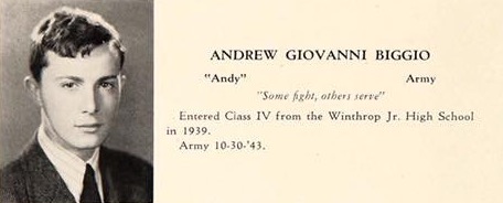 Andrew G. Biggio was born in 1925 and enlisted in the US Army on November 11, 1943 and was assigned as an Infantry replacement to "B" Company, 135th Infantry Regiment, 34th Infantry Division. He was killed in action September 17, 1944 when his unit was assaulting German positions along the Gothic Line in Italy. PFC Biggio was awarded the Bronze Star and Purple Heart during this action. He was born and raised in Winthrop, MA, attended Winthrop schools through the ninth grade and transferred to Boston Latin High School from which he graduated.