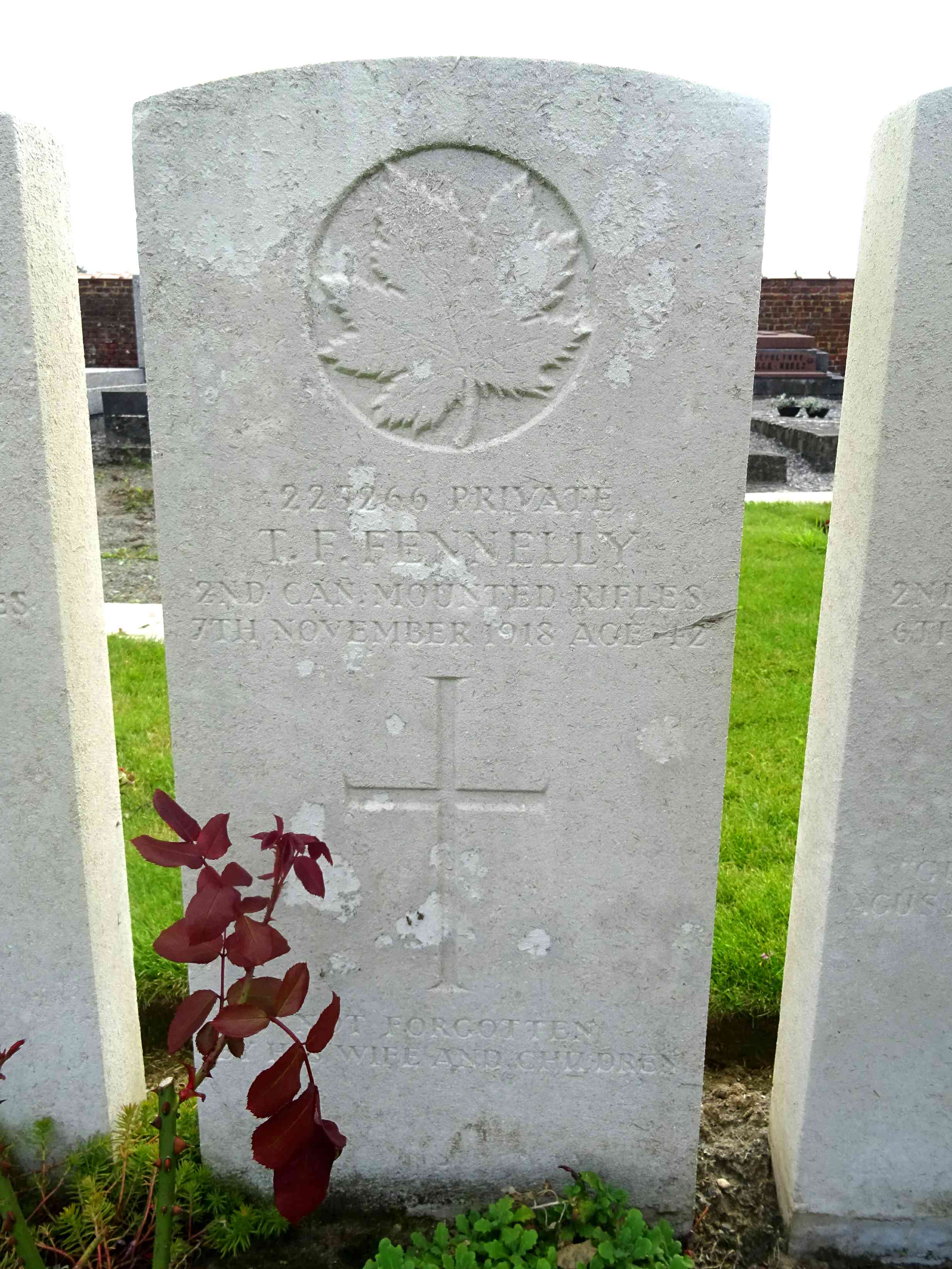 Thomas Francis Fennelly was born at Brooklyn, New York, on October 5, 1876, the son of Irish immigrants, Timothy and Margaret Dunne Fennelly. An engineer by training, Thomas Fennelly and his wife Bessie were raising a family in Massachusetts. When World War I broke out, he felt a duty to help. In July 1917, he traveled to Canada and enlisted in the Canadian Overseas Expeditionary Force and served with the 2nd Canadian Mounted Rifles Battalion. PVT Fennelly died of wounds on November 7, 1918 on the battlefield in France while advancing on enemy positions. He is now buried in the Quievrain Communal Cemetery, Belgium.