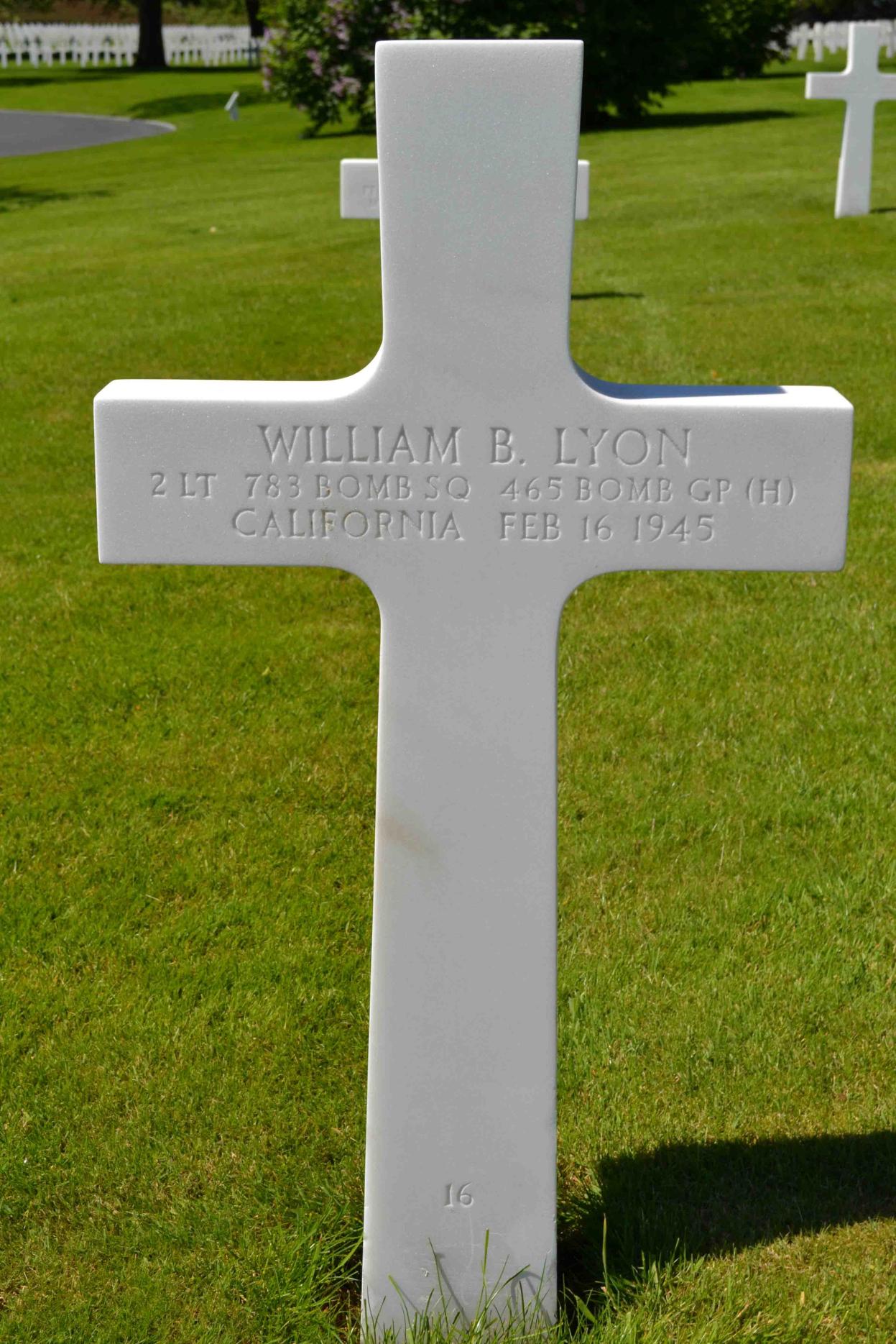 2Lt Lyon was among those who lost their lives in the crash and is now buried in the Lorraine American Cemetery and Memorial, Saint-Avold, Departement de la Moselle, Lorraine, France.
