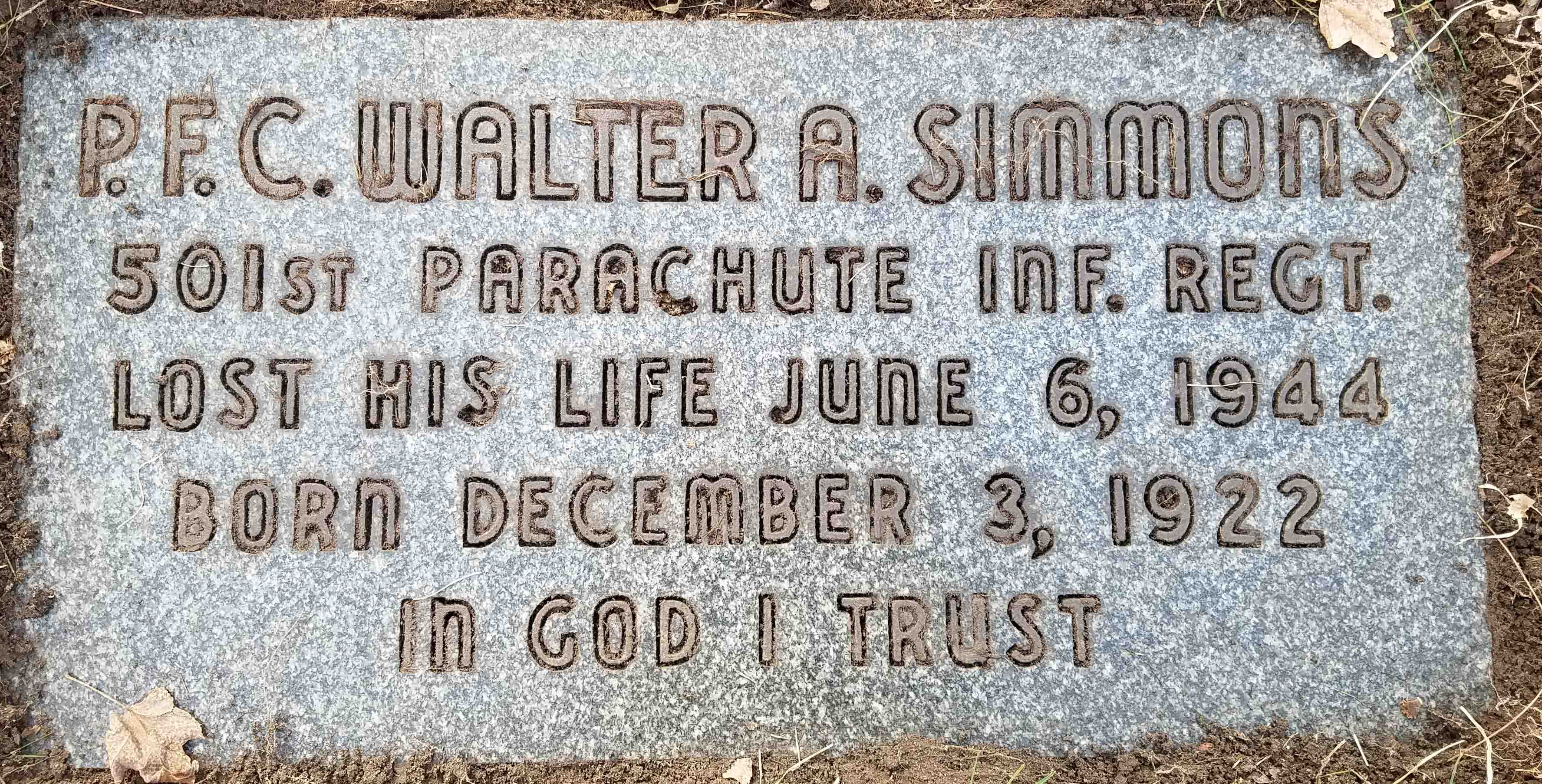 Pfc Walter A. Simmons, paratrooper of the 3/501st PIR’s G Company, took off from station 474 in Welford, UK in the C-47 42-24077 to drop over DZ-C as part of Operation Albany during the Normandy invasion. Their target time was 0120. Their plane was the last of five waves to cross the Cotentin, over air defenses now on full alert. To complicate matters, there were heavy clouds at 1500 feet, gone unreported due to the strict radio silence. Some pilots decided to pull up and find their DZs with the Eureka-Rebecca system, others went low to obtain a visual of their DZs, and a rare few stayed the course through the cloud bank. While approaching DZ-C, flak hit the last three planes, including the 42-24077. The plane crashed in the Norman countryside, killing all aboard.