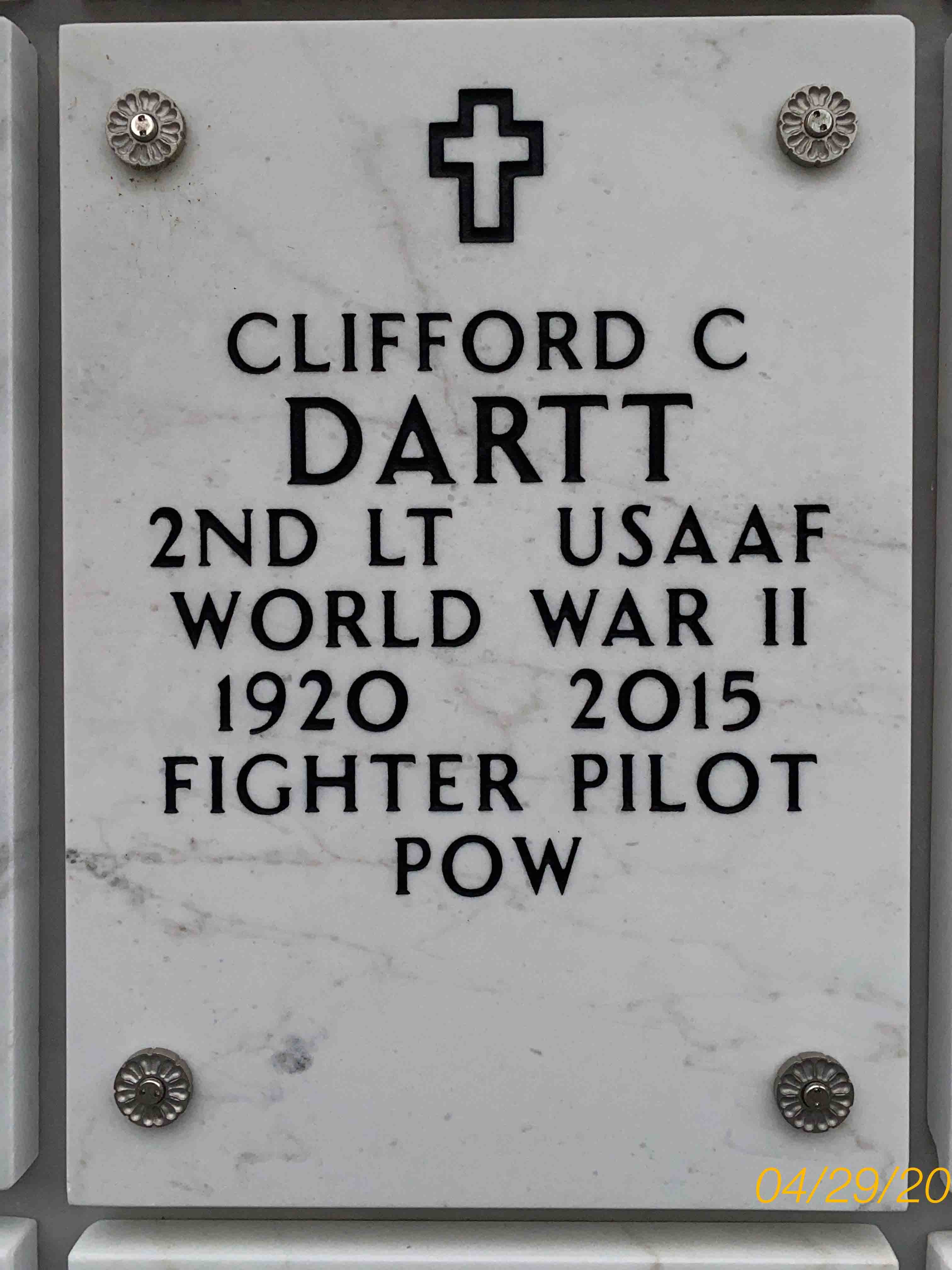 2nd Lt Clifford C. Dartt, co-pilot of the B-17 42-29960 "Nymokymi", took off from station 106 in Grafton Underwood, Northamptonshire, UK on a bombing mission over Gnome and Rhone-Le Mans factory complexes at 1100. The plane was hit by flak and fighter fire, losing its no.4 engine. The crew bailed out of the burning plane. Dartt was taken prisoner and sent to Stalag Luft 3 in Sagan-Silesia until April 1945.