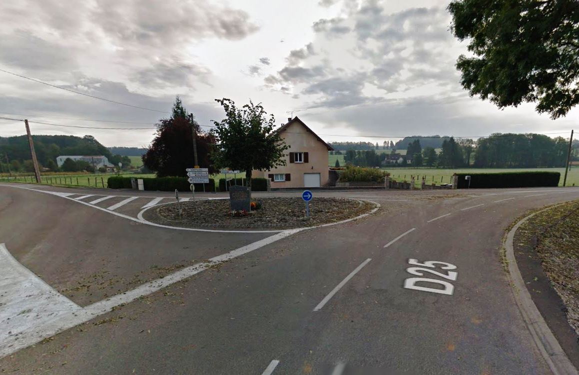 Within a traffic circle for the intersection of D25 and D85 through the town of Vy les Filain
