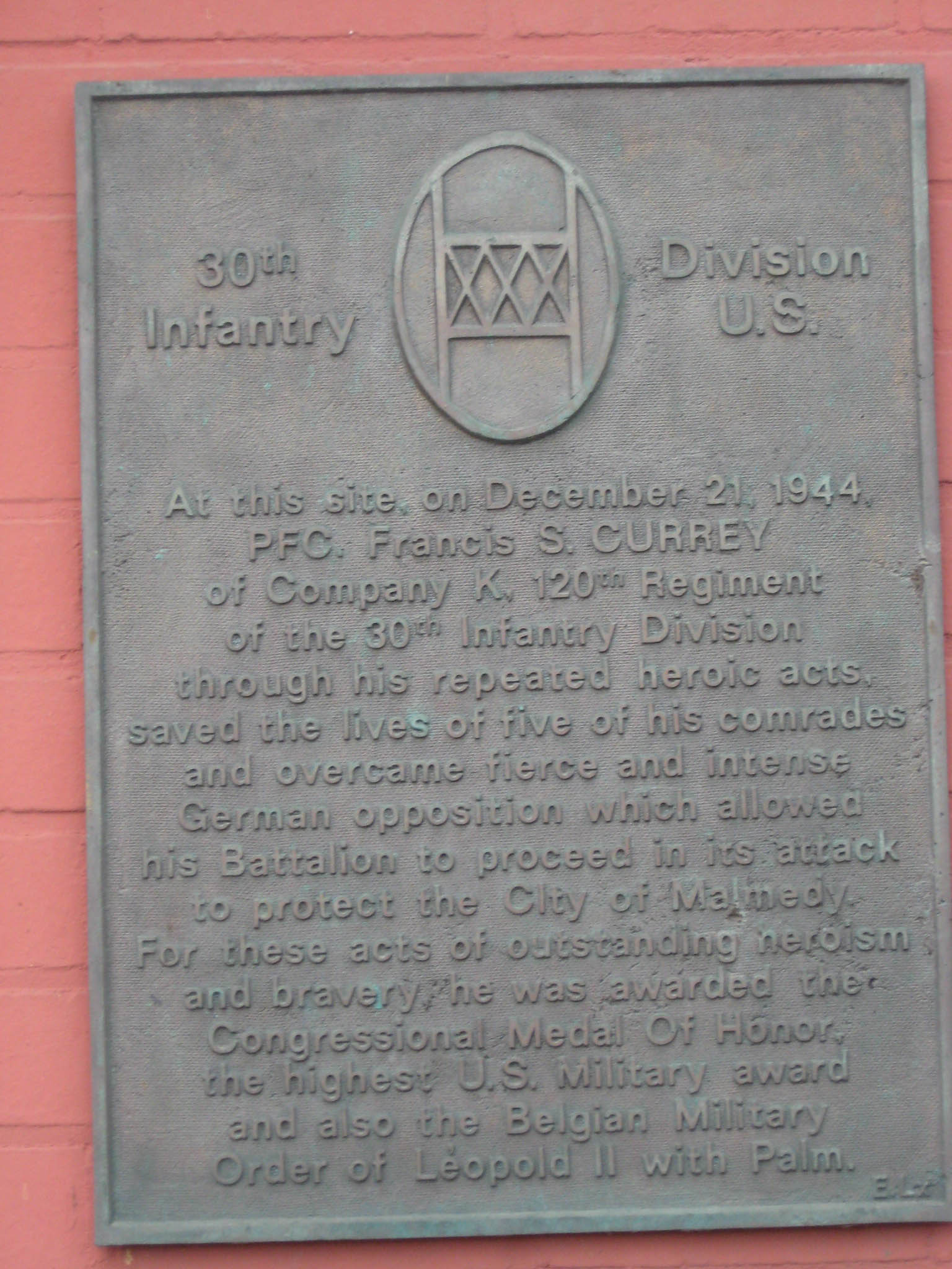 The site contains a plaque for PFC Francis S. Currey of the 120th US Infantry Regiment who was awarded the Medal of Honor for his actions here during WW2.