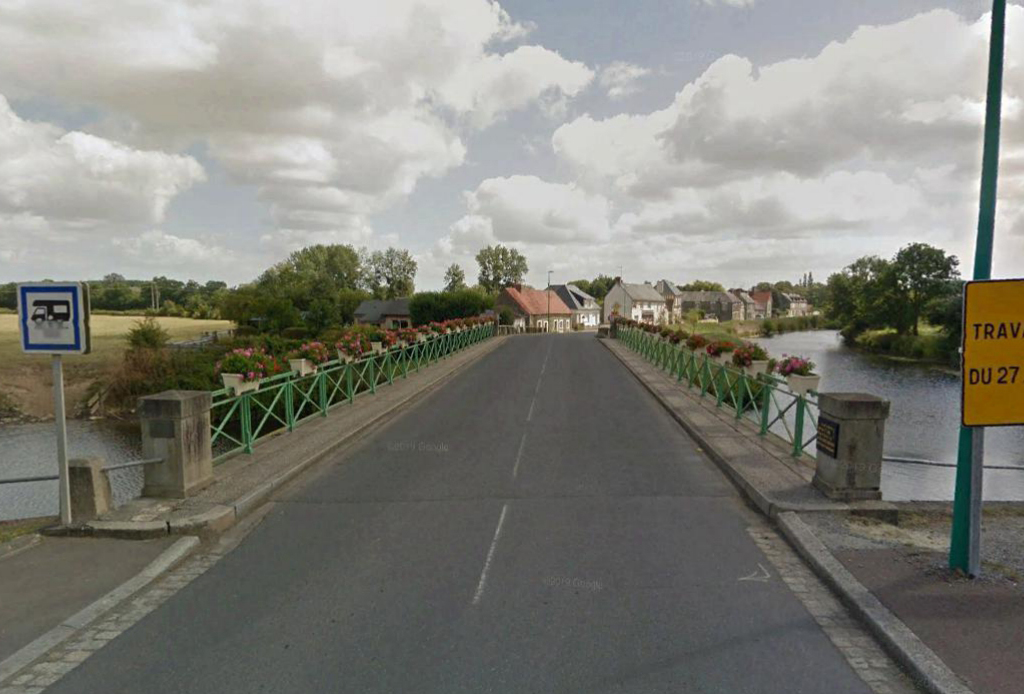 Located at the eastern city limit of Saint-Fromond or western city limit of Airel. The bridge is very near and at the eastern intersection of Rue de la Tuilerie, Rue de la 30e Division US, Rue de l’Eglise, and D8 traffic circle in Saint-Fromond.