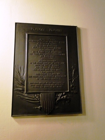 Stone building with small clock tower. In the interior stairwell, there is a plaque commemorating American service.
