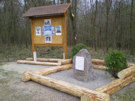 A forest clearing contains a memorial to a US aviator.